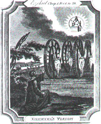 Vi kan också läsa om de goda, utvalda änglarna och deras mångtusende vagnar, om hur Herren själv färdas på kerubens vingar, och kommer flygande på ett moln, och hur ur detta moln Hesekiel får se en hiskelig, kupolformad farkost komma ned och landa på marken med hjul som går in i hjul, och med ett vrål som av ett åskmuller eller reaplan.