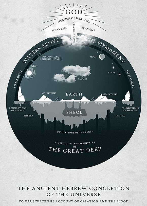 Men tänk efter - hade de den världsbilden när de skrev och sade detta? Nej, de såg en annan bild framför sig. De trodde att jorden var en platt skiva, som vilade på vatten och i vatten, och under denna skiva, där föreställde de sig först att dödsriket fanns, och därefter, långt under skivan och dödsriket, nere i ett oändligt djup, tänkte de sig avgrunden, där änglar var fängslade.