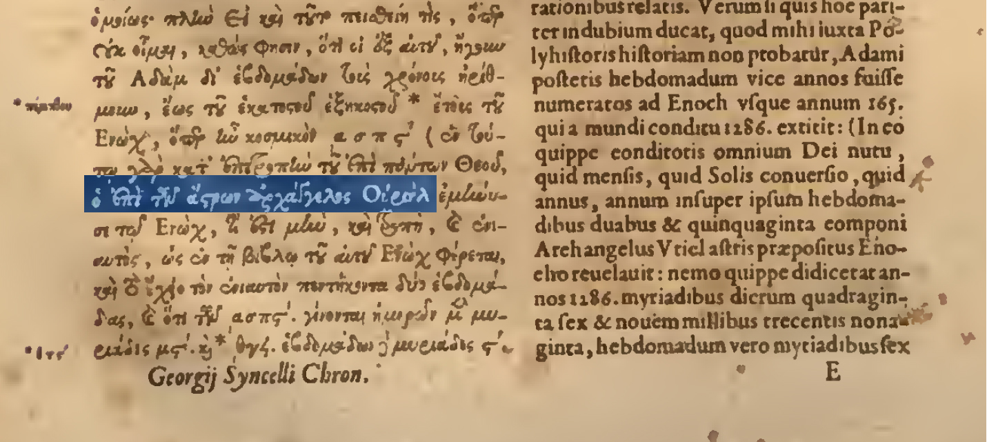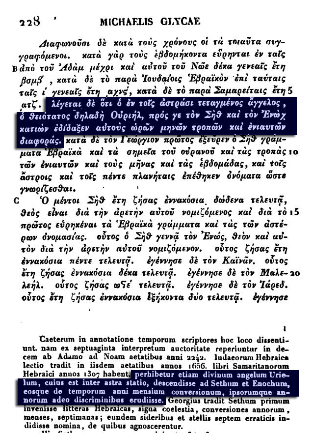 Det här är troligen kommet från Synkellos, men denna grekiska förf. ser ingen anledning att ändra eller ifrågasätta att Uriel var placerad, i detta fall, stationerad bland stjärnorna. Att betydelsen av ordet kosmos skulle vara världen, som i denna världen, är helt uteslutet, när man läser dessa författare och krönikörer.* Dessutom, om man tittar i Enok 75:3, där Uriel också omtalas som placerad/satt över stjärnorna (himlaljusen), står det som tillägg 'världen' där också, men de grekiska författarna (om de hade tillgång också till den astronomiska delen av Enoks bok), har inte sett någon anledning utifrån det, att tillägga i sina referat, att Uriel också var satt över världen - vilket visar att ordet på det stället, som översatts alam i etiopiskan (den enda översättningen tillgänglig nu), betydande världen, helt säkert var ett likadant missförstånd som det ovan, när de läste 'kosmos' i grekiskan och trodde att det betecknade världen (denna) och inte stjärnhimlen (som i den äldre grekiskan).