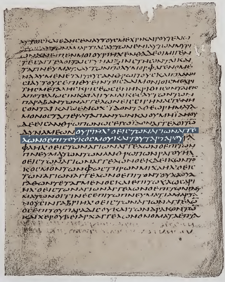 | Οὐριήλ, | ὁ | εἷς | τῶν | ἁγίων | ἀγγέλων | ὁ | ἐπὶ | τοῦ | κόσμου | καὶ | τοῦ ταρτάρου. |